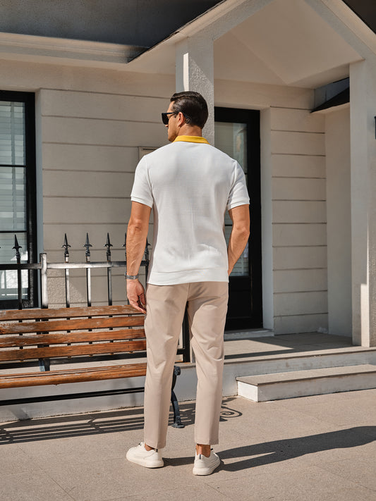 Men's Knit Polo Shirts Casual Short Sleeve V Neck Golf Shirts for Men Waffle Texture Contrast Color Design with Pocket